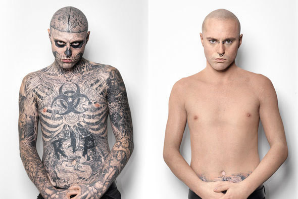 Самый татуированный человеком в мире — Лаки Даймонд Рич. Его тело целиком покрыто тату, в том числе и мочки , и внутри ушей,и кожа между пальцев, веки, рот.